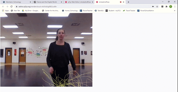 As a guest artist, I created the “Dance and the Digital World” curriculum. This curriculum consisted of a website and a series of sketches made on p5.js utilizing PoseNet to create real-time interactions with dancers via webcam and internet browser. The primary goal was to expose students to ideas about Computer Vision, Machine Learning and real-time interactions. Most importantly, we wanted to show them that they could be creators of digital media and technology instead of just passive consumers.